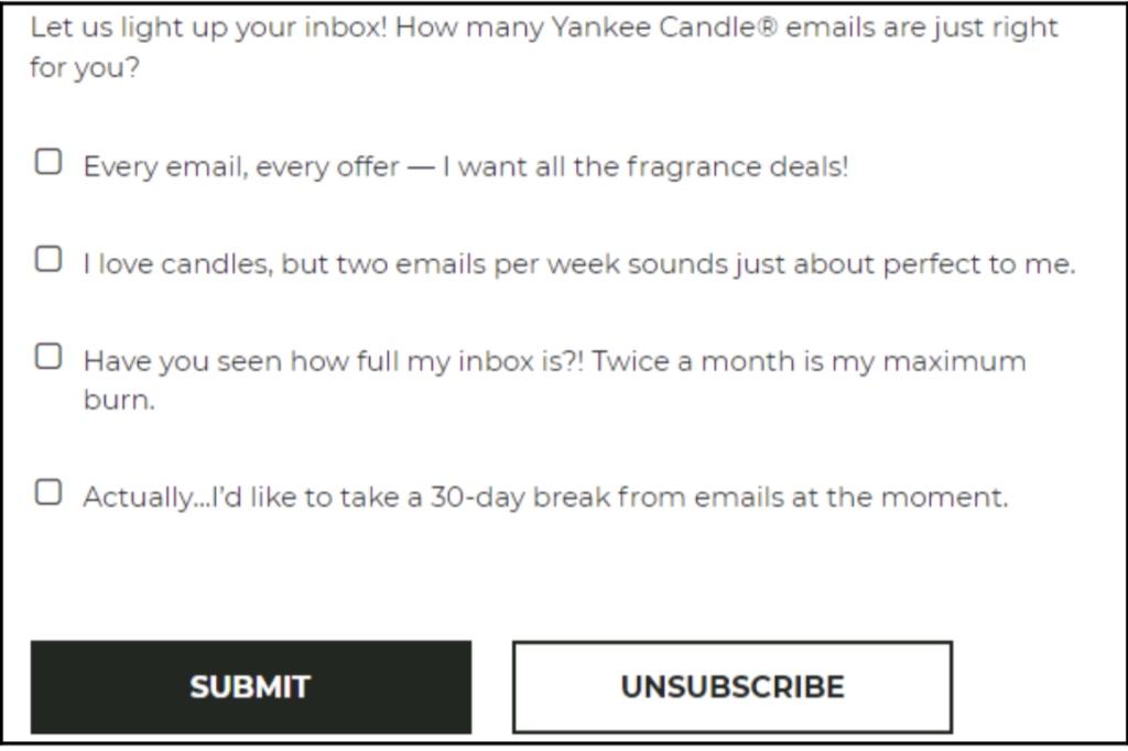 Mengirim email setiap hari mungkin terlalu banyak untuk beberapa pelanggan. Pertimbangkan untuk menyediakan opsi untuk frekuensi mingguan atau dua mingguan. Yankee Candle memberi pelanggan mereka banyak pilihan untuk mendapatkan frekuensi yang tepat.