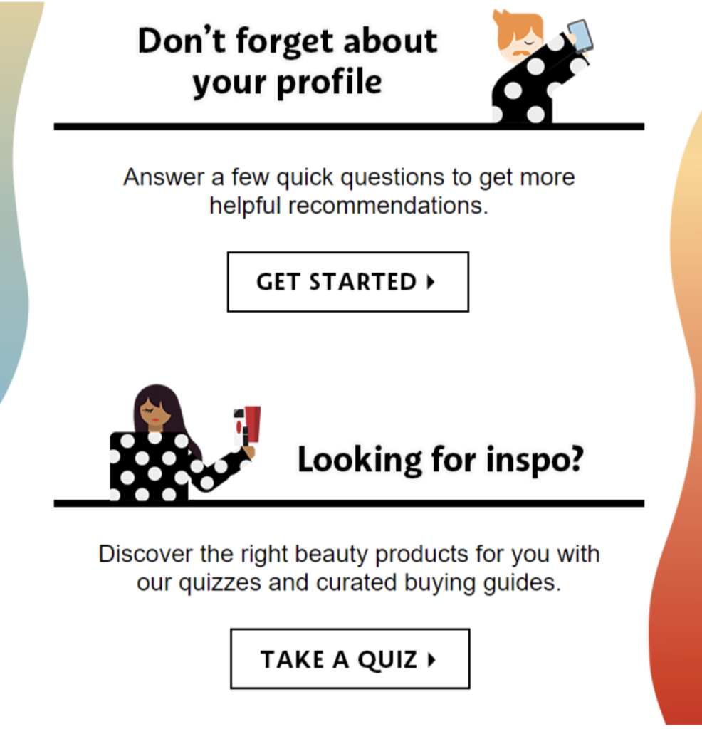 Sephora mengumpulkan preferensi dengan berbagai cara melalui email seri sambutan mereka. Pertama, mereka meminta pelanggan baru untuk menjawab beberapa pertanyaan untuk mendapatkan rekomendasi produk yang lebih baik. Kedua, mereka mempermainkan proses preferensi dengan mengundang pelanggan untuk mengikuti kuis untuk menentukan apa yang paling mungkin mereka beli.