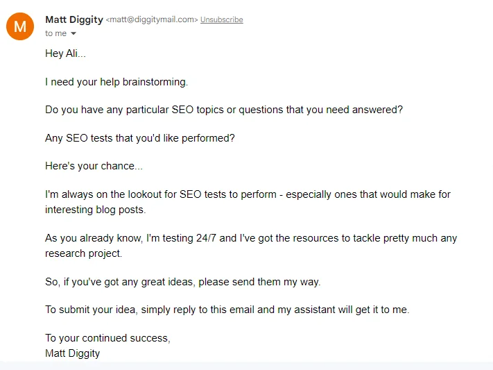 Kirimi mereka email ramah, seperti yang baru-baru ini saya terima dari Matt Diggity di Diggity Marketing. Dia langsung bertanya kepada saya konten seperti apa yang ingin saya lihat di blognya dan di buletinnya. Dia bahkan mendorong pelanggan untuk mengiriminya email dengan preferensi mereka.