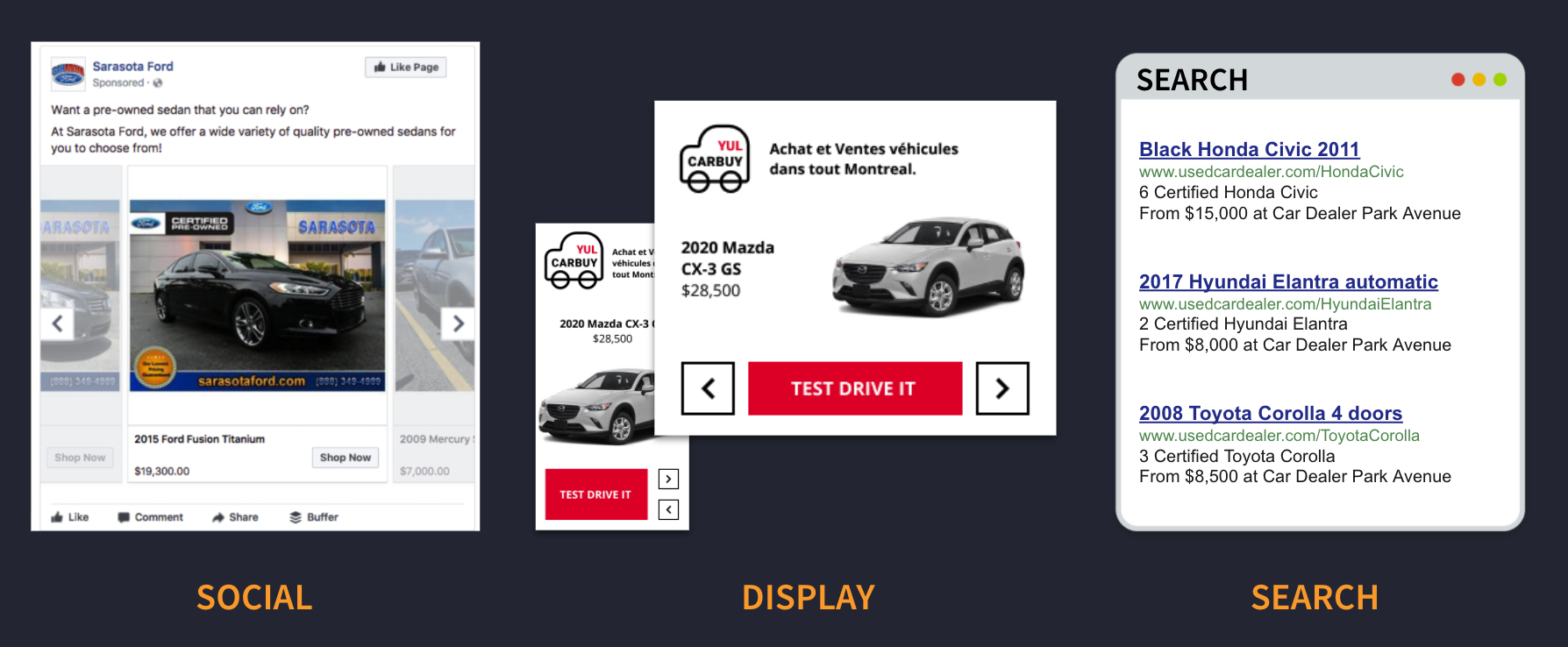 Namun, inovasi terbaru dalam kampanye dinamis berarti Anda dapat menangkap calon pembeli tersebut jauh lebih awal dalam proses penelitian. Saluran sosial dan tampilan sangat penting untuk merebut lebih banyak real estat mental dari calon pembeli mobil.