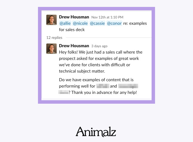 Ini berlaku dua arah, tentu saja. Tim penjualan harus dilatih untuk menjangkau tim saat mereka membutuhkan sumber daya. Inilah eksekutif akun kami, Drew, yang melakukan hal itu. Ini mengarah ke utas panjang dan bermanfaat dengan banyak contoh bagus, beberapa di antaranya akan menjadi bagian dari posting blog Animalz di masa depan.