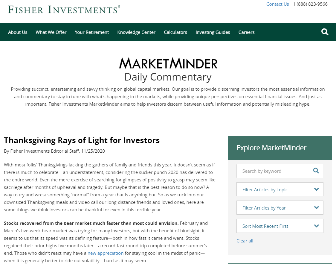 MarketMinder adalah contoh yang bagus untuk membuat dan menerbitkan konten keuangan yang sesuai dengan audiens targetnya. Market Minder adalah publikasi harian yang menganalisis peristiwa terkini yang memengaruhi pasar. Semua konten mereka ditulis dari sudut pandang pembaca.