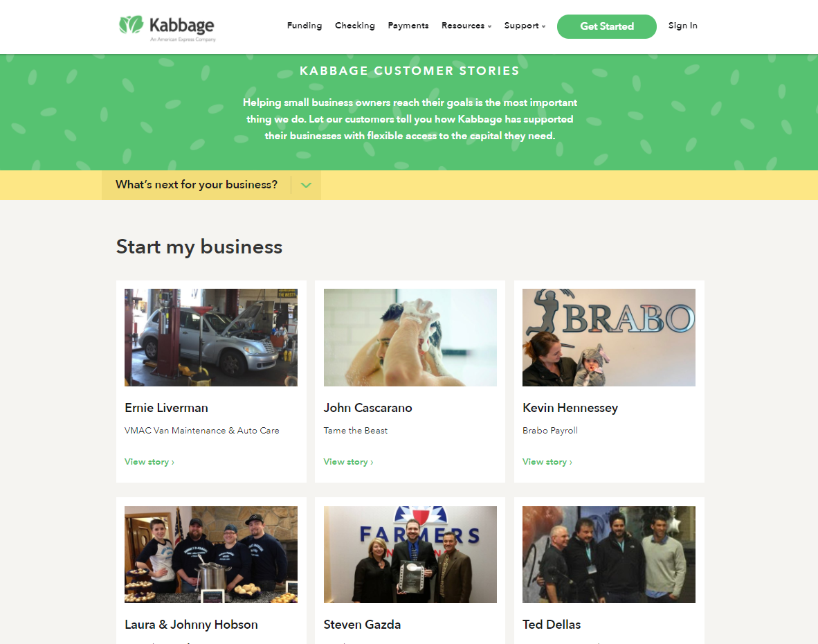 Halaman Di Balik Bisnis menampilkan studi kasus sebagai kisah sukses pelanggan. Halaman ini menampilkan kisah sukses pengusaha kecil yang telah bermitra dengan Kabbage.