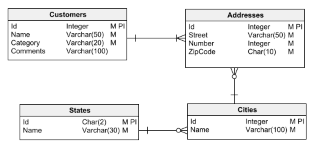 SELECT StreetName, StreetNumber, Cities.Name AS City, States.Name AS State FROM Addresses INNER JOIN Cities ON Cities.CityId = Addresses.CityId INNER JOIN States ON States.StateId = Addresses.StateIdDalam hal ini, kami menggunakan tabel pencarian untuk Kota dan Negara Bagian.
