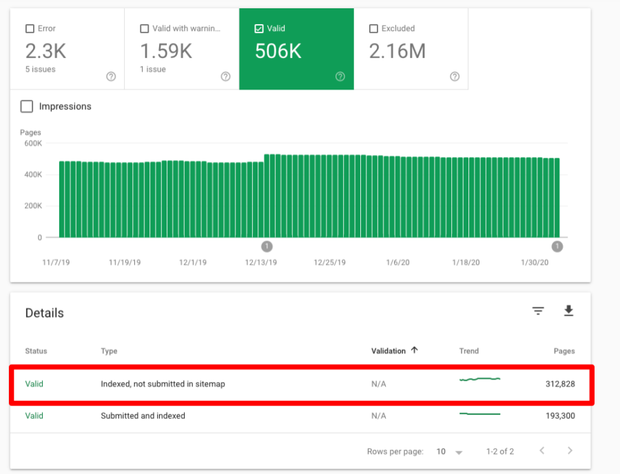 - Periksa laporan “Valid” untuk URL yang seharusnya tidak diindeks. Status “Diindeks, tidak dikirimkan dalam peta situs” bisa jadi bagus untuk mengaudit URL ini.