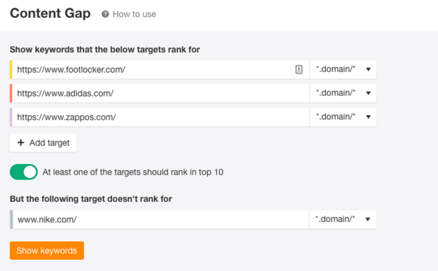- Gunakan alat seperti AHREFs untuk melakukan analisis kesenjangan konten Anda dan pesaing Anda untuk menentukan kata kunci di mana peringkat mereka baik dan Anda tidak. Tambahkan kata kunci inti apa pun ke lembar "Kata Kunci Utama".