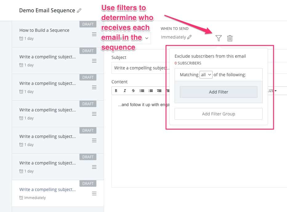 Jika Anda ingin benar-benar terperinci, Anda dapat menggunakan filter untuk memutuskan siapa yang mendapatkan email individual dalam urutan Anda.
