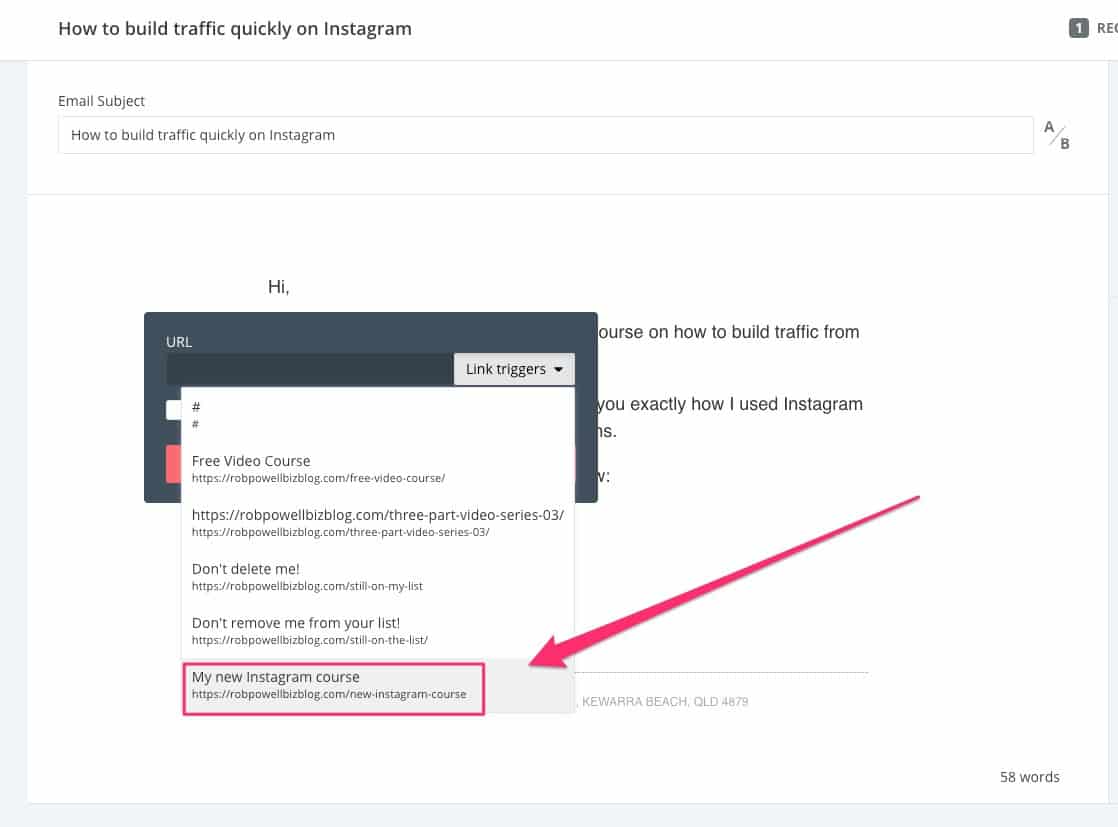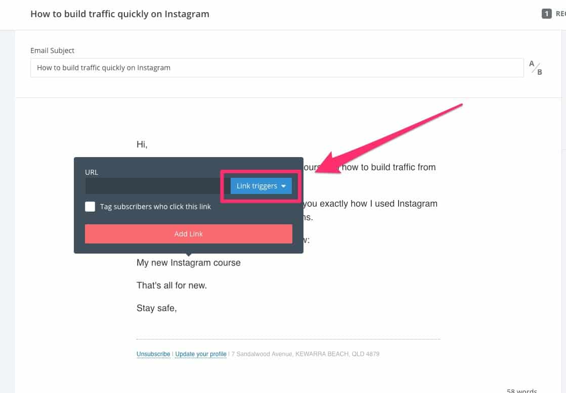 Pemicu tautan adalah tautan yang Anda tempatkan di email. Saat seseorang mengklik pemicu tautan, itu memicu tindakan, seperti menambahkan tag ke pelanggan itu.