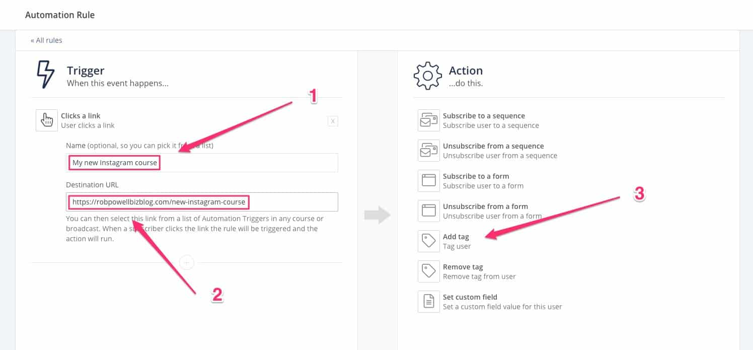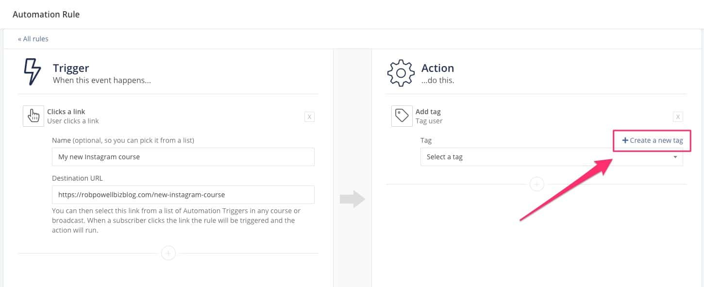 Berikan nama pemicu tautan Anda dan URL tujuan (di sinilah pelanggan Anda bisa mendapatkan informasi lebih lanjut tentang kursus Instagram yang Anda usulkan). Dan kemudian, di panel sisi kanan, klik 'Tambahkan tag':