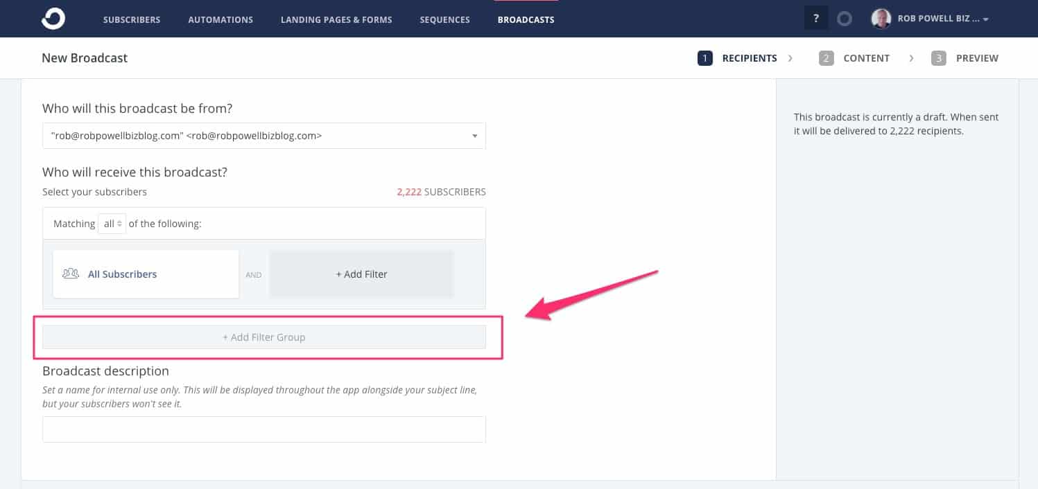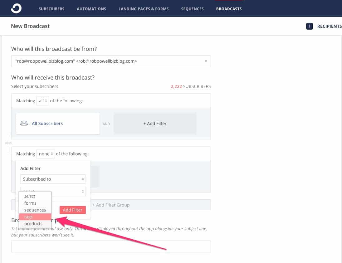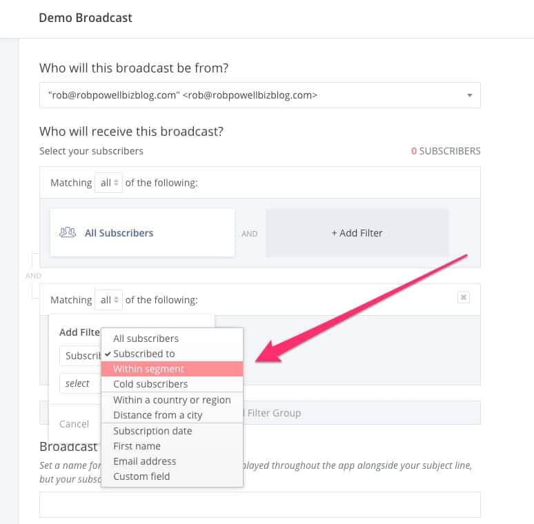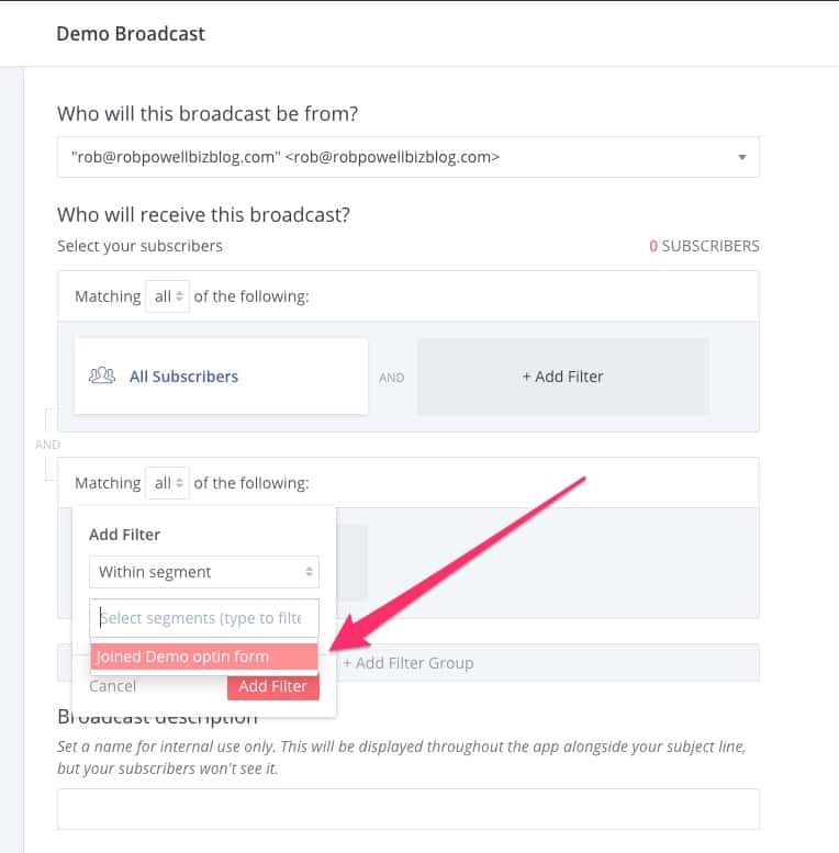 Jika kita hanya ingin mengirim email kepada orang-orang di segmen itu, sekarang kita perlu menerapkan segmen itu sebagai filter untuk siaran kita. Kembali ke demo broadcast yang kita buat sebelumnya, dan tambahkan filter dengan pengaturan 'all':