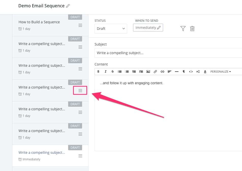Seperti yang saya katakan, ini adalah UI paling ramah pengguna yang pernah saya lihat untuk membuat urutan email. Salah satu fitur yang sangat berguna adalah tombol hamburger yang memungkinkan Anda menyeret email ke atas dan ke bawah dan mengubah urutannya: