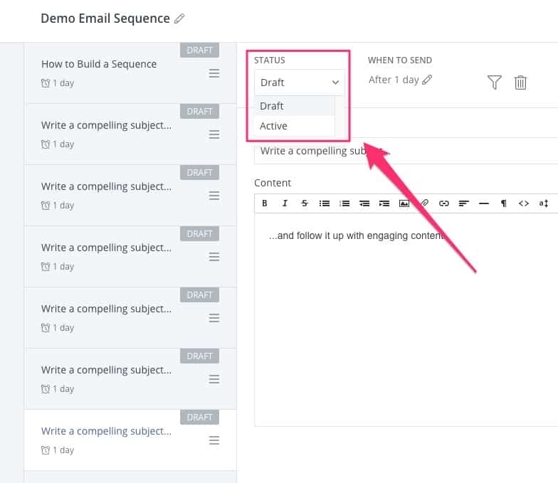 Untuk setiap email dalam urutan, Anda perlu mengubah 'status' dari 'draf' menjadi 'aktif' setelah siap digunakan: