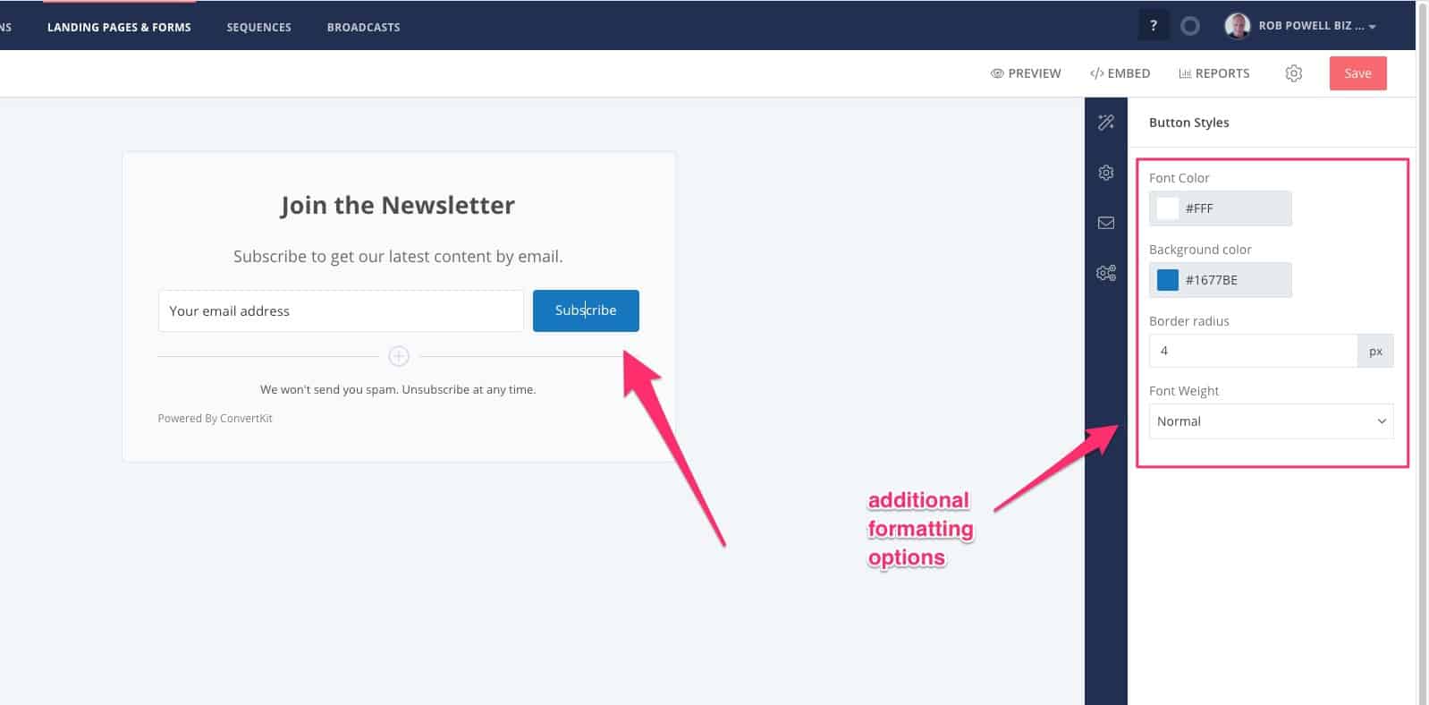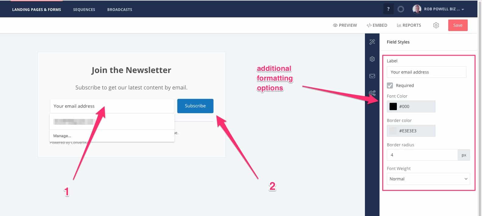 Selanjutnya, klik pada area formulir yang bertuliskan “alamat email Anda”, dan Anda akan melihat opsi pemformatan tambahan di panel sisi kanan: