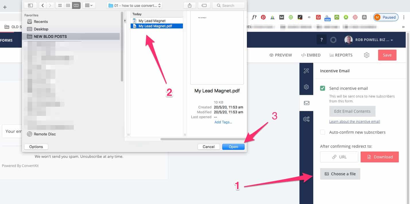 Temukan peningkatan konten atau magnet utama di hard drive Anda dan unggah ke ConvertKit: