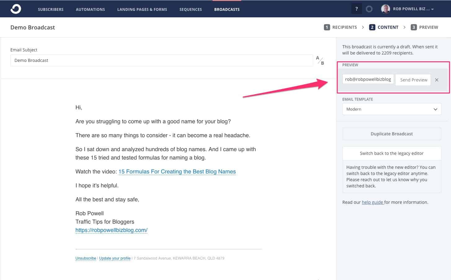 Pembuat email di ConvertKit sama, baik Anda membuat urutan email atau siaran satu kali.