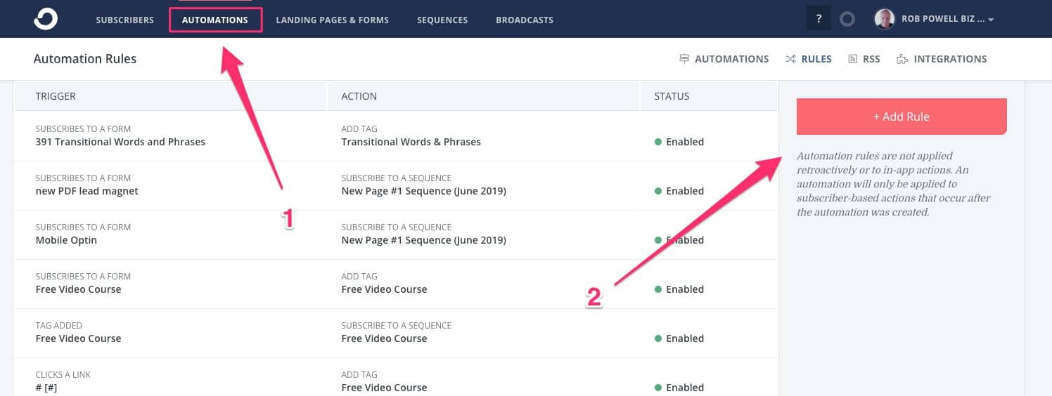 Setelah akun Teachable Anda terhubung ke ConvertKit, buka 'Otomasi' di CK lalu 'Aturan' dan klik 'Aturan Baru'.