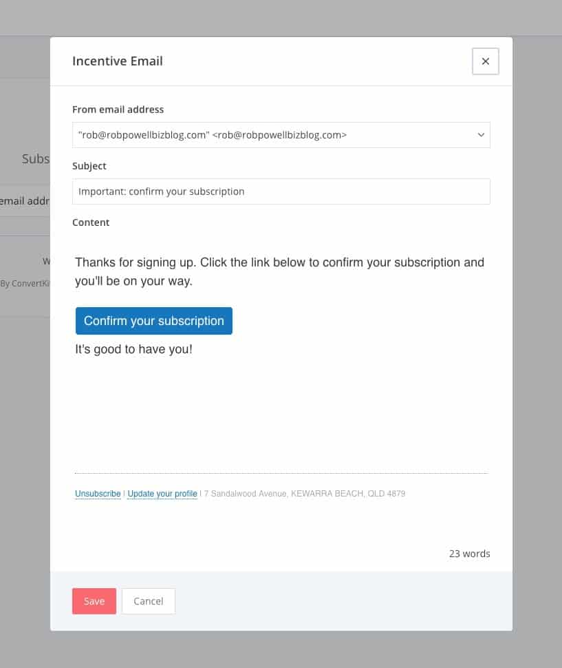 Penting untuk disadari di sini bahwa 'email insentif' adalah istilah ConvertKit untuk 'email konfirmasi'. Saat Anda mencentang kotak 'email insentif', pelanggan Anda akan menerima email konfirmasi. Dan itu berarti mereka tidak akan ditambahkan ke daftar Anda sampai mereka mengklik tombol konfirmasi di email awal itu.