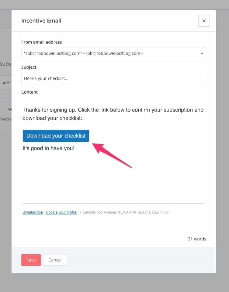 Sekarang, pelanggan Anda dapat mengunduh freebie mereka dari email selamat datang. ConvertKit telah menggabungkan konformasi email dan pengiriman magnet timah dalam satu langkah mudah: