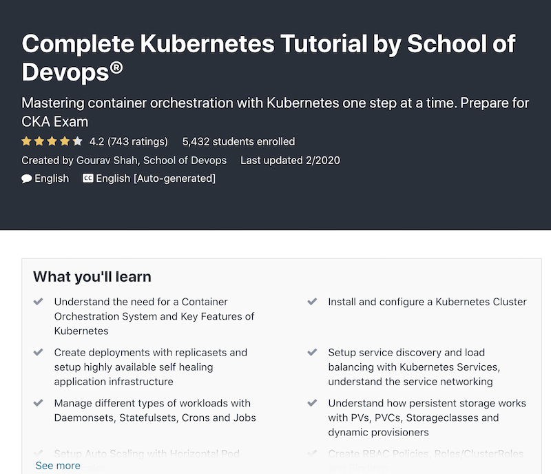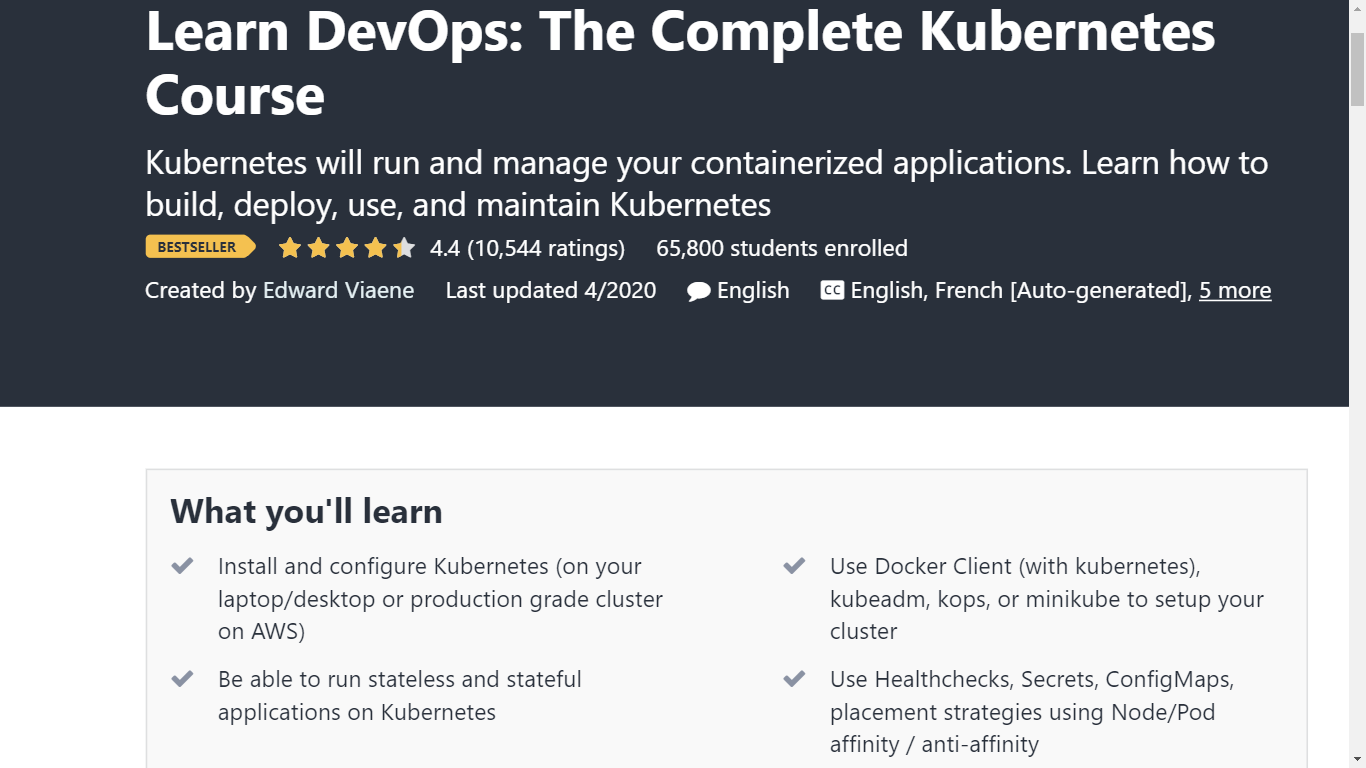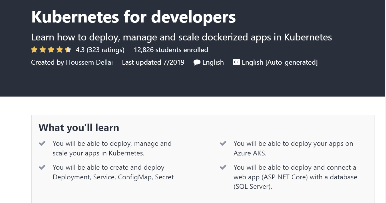 Pada akhir kursus ini, Anda akan dapat menerapkan, menggunakan, dan memelihara aplikasi Anda di Kubernetes. Sertifikat kelulusan juga akan diberikan oleh Udemy setelah menyelesaikan kursus ini.