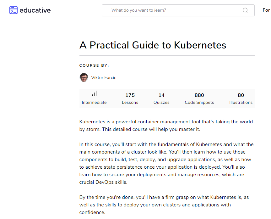 Panduan Praktis untuk Kubernetes berisi 175 pelajaran. Setiap pelajaran bertujuan untuk mengajarkan Anda satu konsep. Hal yang hebat dengan kursus ini adalah, di akhir pelajaran, ia meminta untuk muncul kuis, yang memungkinkan pelajar mengingat konsep dan pembelajaran.