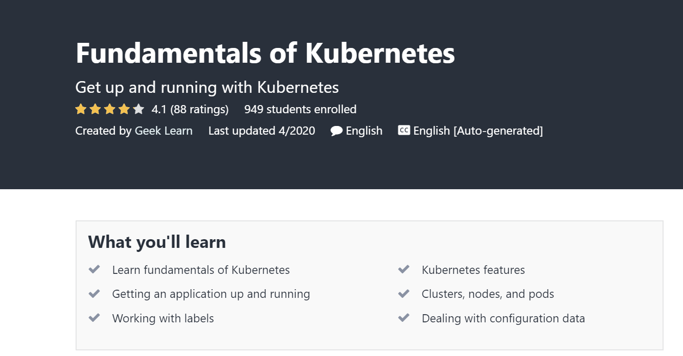 Seperti namanya, ini mencakup dasar dasar Kubernetes. Setiap video yang dibahas dalam kursus ini mencakup eksekusi perintah secara langsung. Ini menyentuh beberapa topik menengah dan lanjutan juga, seperti dasbor Kubernetes, mengonfigurasi data dan rahasia aplikasi, pemantauan dan pencatatan, dan terakhir, otentikasi, dan otorisasi.