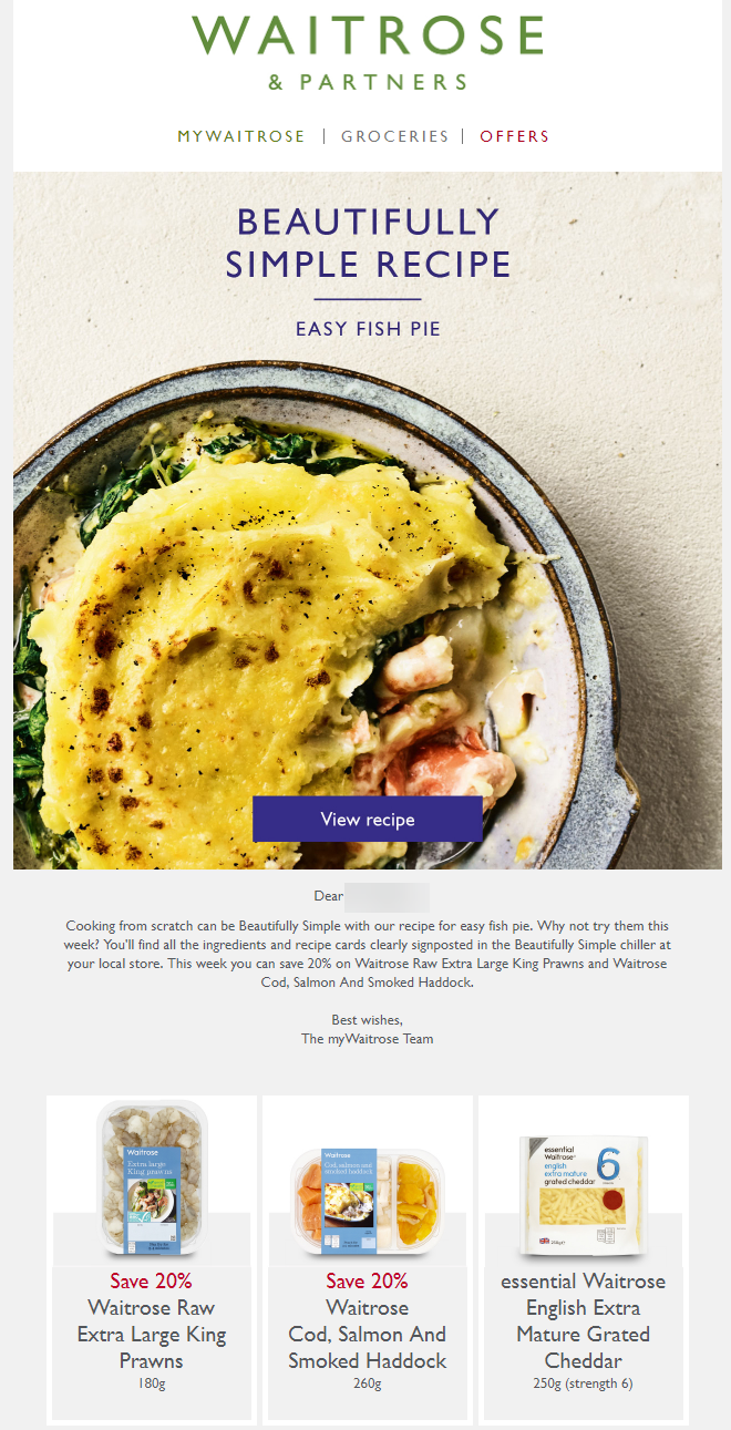 Kedua, Waitrose telah melihat tingkat keterlibatan yang sangat tinggi dengan email berbasis resep. Jenis kampanye ini telah menjadi tren di kalangan pengirim supermarket, dengan dualitas keduanya mendorong tingkat keterlibatan yang lebih tinggi, sekaligus juga memengaruhi konversi. Konten ini memungkinkan pelanggan untuk bergerak maju untuk membeli bahan-bahan yang relevan dari situs web, membantu mengurangi gesekan dari email ke pembelian tanpa mengorbankan tetapi meningkatkan kualitas dan relevansi pesan.