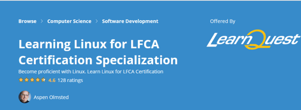 Kursus sertifikasi LFCA ini ditawarkan di platform Coursera oleh LearnQuest, mitra pelatihan pilihan dari perusahaan, organisasi, dan lembaga pemerintah terkemuka di dunia.