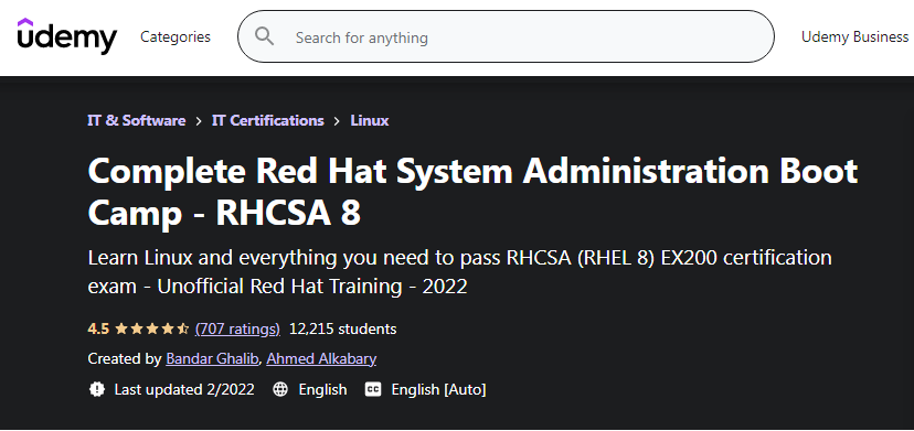Udemy menawarkan kursus ini kepada semua kandidat ambisius yang ingin menjadi Red Hat Certified System Administrator (RHCSA). Isi kursus sesuai dengan ujian RHCSA (EX200) yang dikelola oleh Redhat.