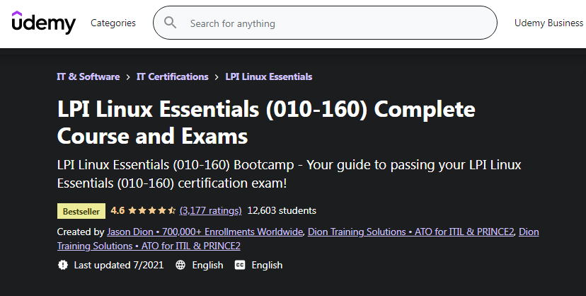 Kursus ini dirancang oleh Udemy, platform pendidikan terbesar di dunia dengan lebih dari 30 juta pengunjung bulanan dari 180+ negara yang terlibat dan database lebih dari 150.000 kursus. Kursus ini mempersiapkan Anda untuk ujian Linux Essentials (010-160) dari LPI (Linux Professional Institute).