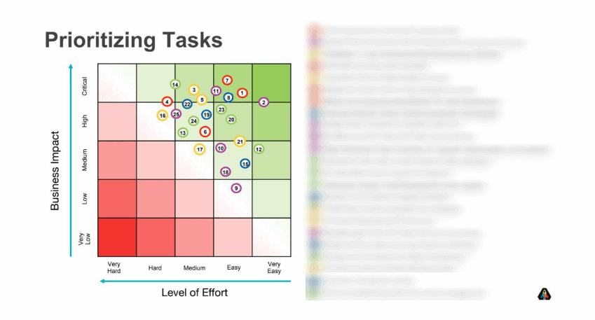Setelah semua tujuan bisnis ini ditulis, tim Data Discovery memprioritaskannya berdasarkan dampak bisnis dan tingkat upaya yang diperlukan, dan menetapkan peta jalan implementasinya bergerak dari tugas yang paling penting dan berharga ke yang kurang penting: