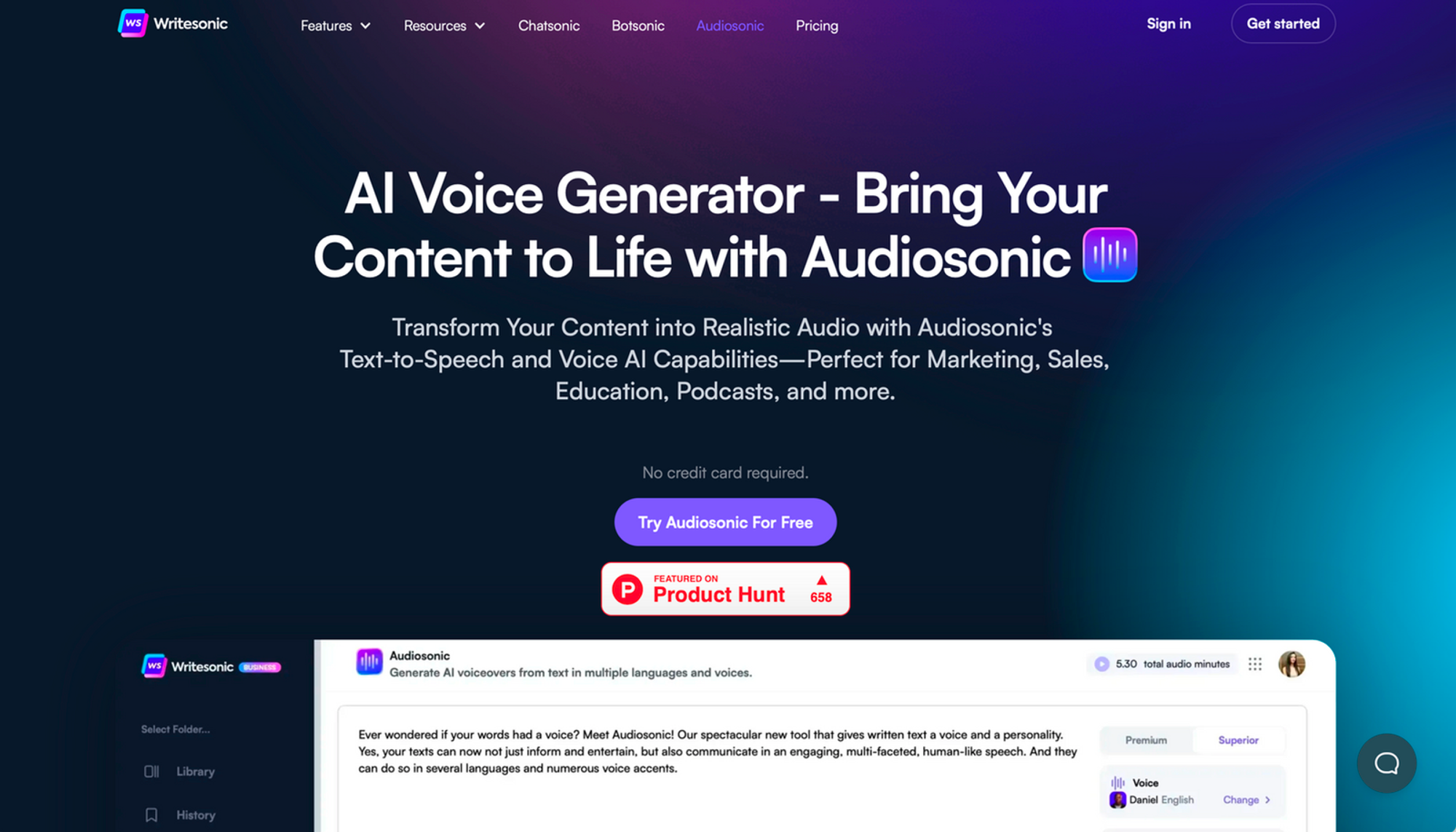 Audiosonic menonjol dari yang lain. Selain menjadi generator suara AI dari Writesonic, ini adalah alat lengkap untuk semua kebutuhan pembuatan konten Anda. Dengan Audiosonic, Anda tidak hanya meningkatkan audio, Anda juga meningkatkan keseluruhan konten game Anda.