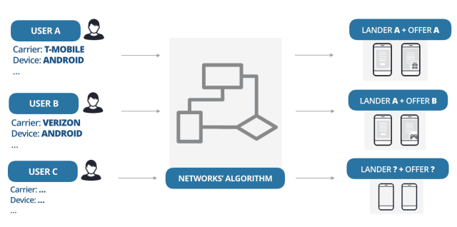 Setelah itu, setiap penawaran yang memenuhi kondisi jenis lalu lintas masuk dialihkan ke algoritme pengoptimalan. Perangkat lunak pemasaran afiliasi seperti Scaleo kemudian akan menentukan faktor distribusi setiap penawaran dan mendistribusikan penawaran yang sesuai.