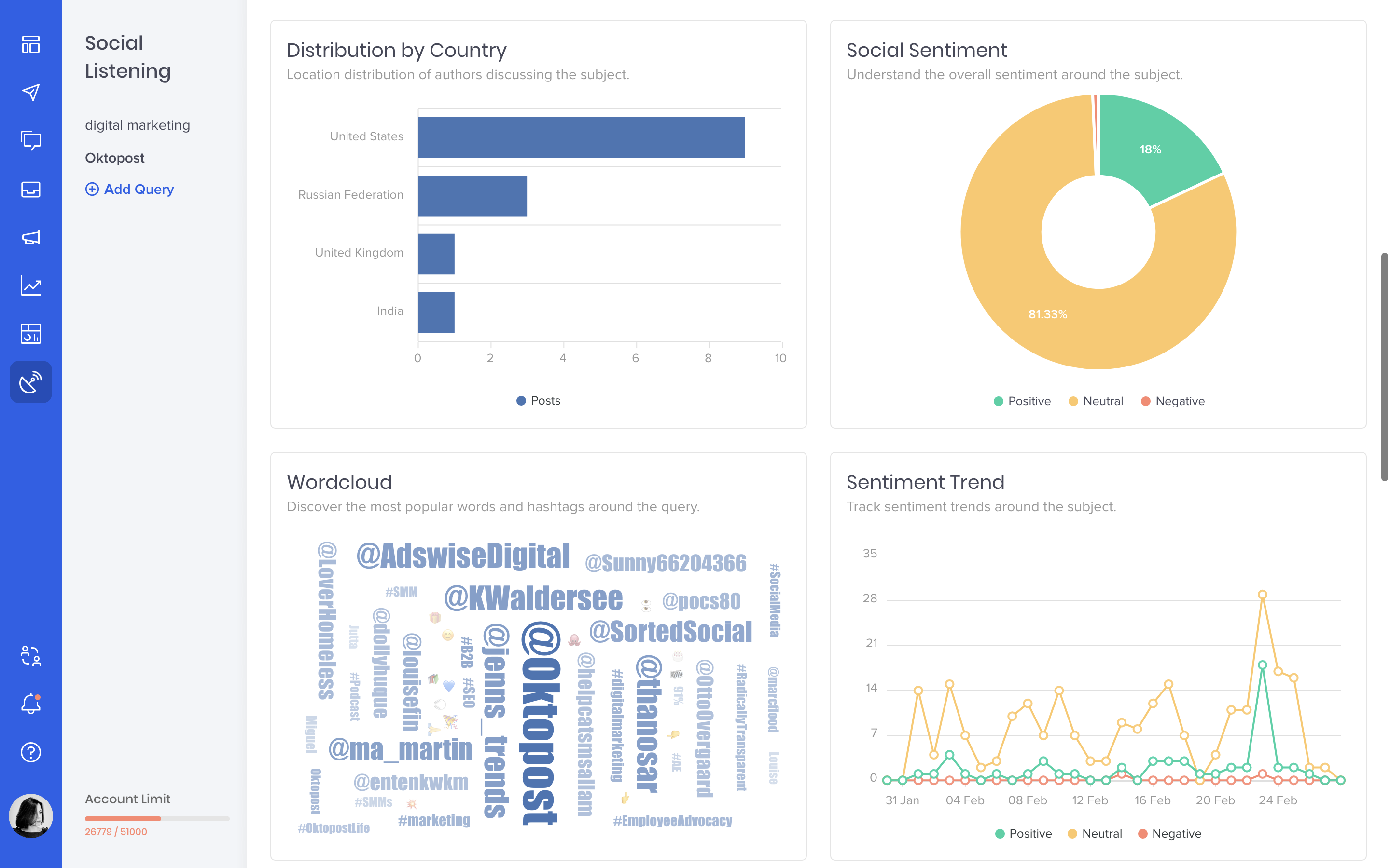 Dengan platform mendengarkan sosial modern, Anda dapat dengan cepat membandingkan berapa banyak sebutan dan interaksi yang dihasilkan oleh masing-masing pesaing Anda. Banyak alat pendengar sosial juga menawarkan analisis yang disebut sentimen media sosial. Ini membantu Anda mengetahui berapa persentase penyebutan yang positif vs. negatif dan untuk mengetahui keseluruhan perasaan publik tentang Anda.