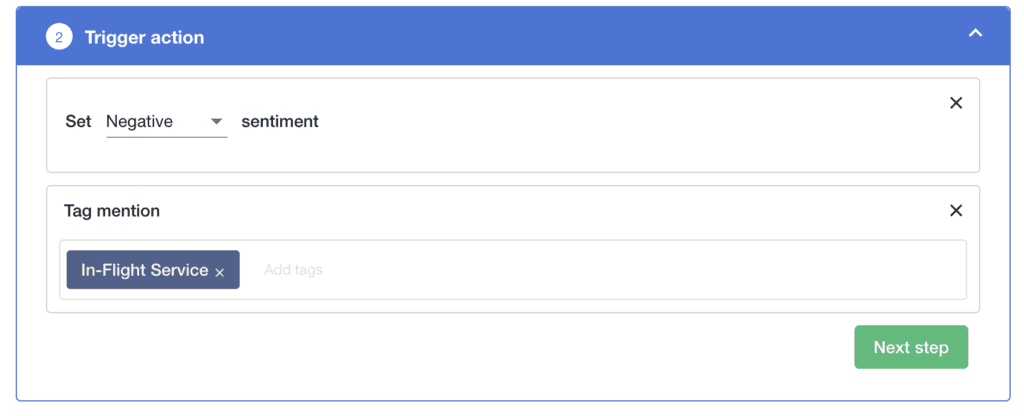 Sekarang, Anda telah melihat ada sentimen negatif yang meningkat di tag Layanan Dalam Penerbangan Anda. Setelah diperiksa lebih lanjut, Anda menemukan bahwa ada peningkatan jumlah penumpang yang mengeluh tentang layanan dalam penerbangan Anda, lebih khusus lagi awak pesawat dan sikap mereka yang tidak profesional terhadap penumpang. Untuk mengawasi situasi dan memastikan tidak ada penyebutan yang lolos dari sentimen negatif, Anda dapat mengotomatiskan penandaan sentimen.