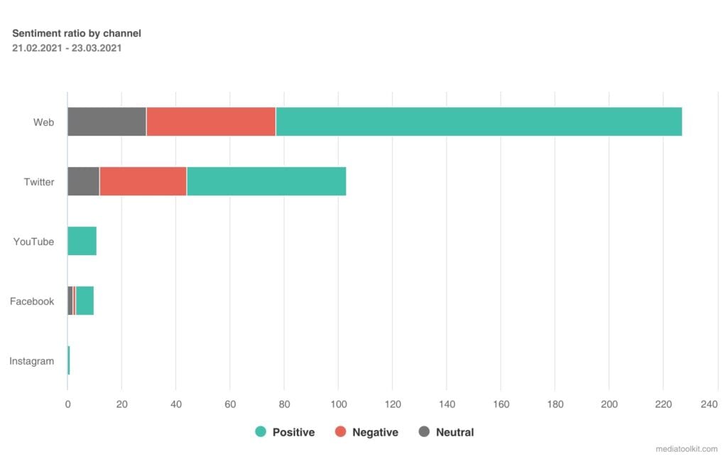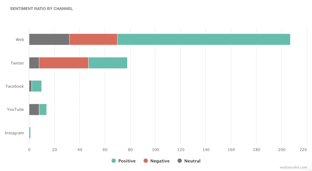 Anda dapat membandingkan jumlah penyebutan merek dan menganalisis sentimen mereka melalui saluran yang berbeda . Dengan cara ini, Anda dapat melihat di mana merek Anda berkinerja terbaik dan terburuk. Dengan menggunakan informasi ini, Anda dapat melihat apa dan di mana Anda dapat meningkatkan untuk lebih melibatkan audiens Anda. Atau, Anda mungkin sampai pada kesimpulan bahwa saluran media sosial tertentu tidak cocok untuk merek Anda. Either way, Anda akan tahu dan dapat membuat keputusan yang tepat.