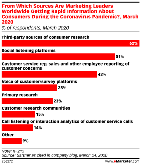 Penelitian yang dilakukan oleh Gartner pada tahun 2020 dan dilaporkan oleh eMarketer semakin menegaskan pentingnya mendengarkan secara sosial pada tahun 2020. Ketika ditanya “Dari sumber mana Anda mendapatkan informasi cepat tentang konsumen selama pandemi virus corona?” , 51% responden menjawab dengan platform mendengarkan sosial – menempati posisi kedua setelah sumber riset konsumen pihak ketiga .