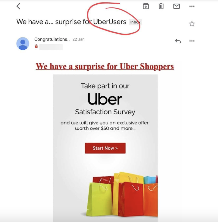 Konsep email phishing survei Uber ini sederhana. Pelanggan diminta untuk mengklik link di dalam email, di mana mereka akan diarahkan ke situs web yang meminta informasi pribadi. PII ini pada akhirnya akan digunakan untuk tujuan jahat.