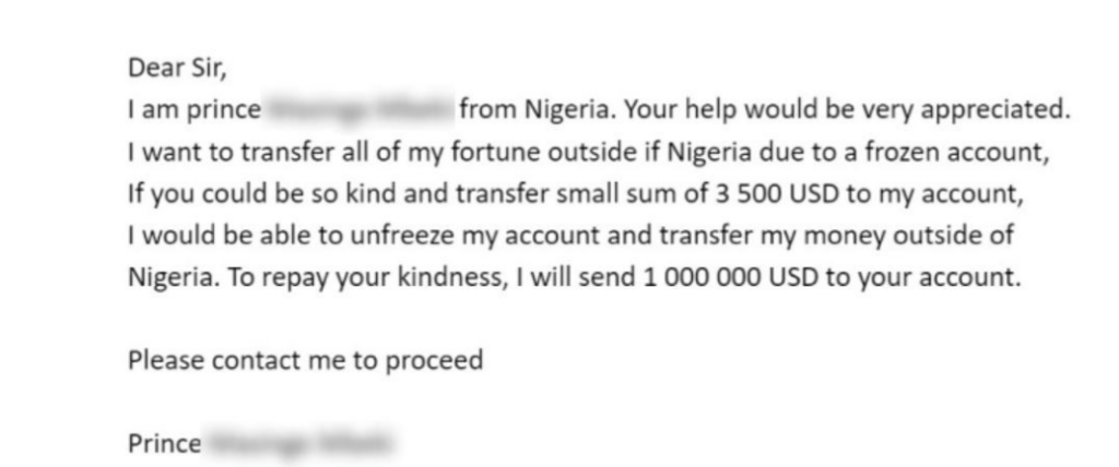Secara umum, setiap email penipuan 419 menampilkan latar belakang yang menarik, referensi ke individu kaya , dan permintaan untuk mentransfer atau menahan uang atas nama “pangeran . ”