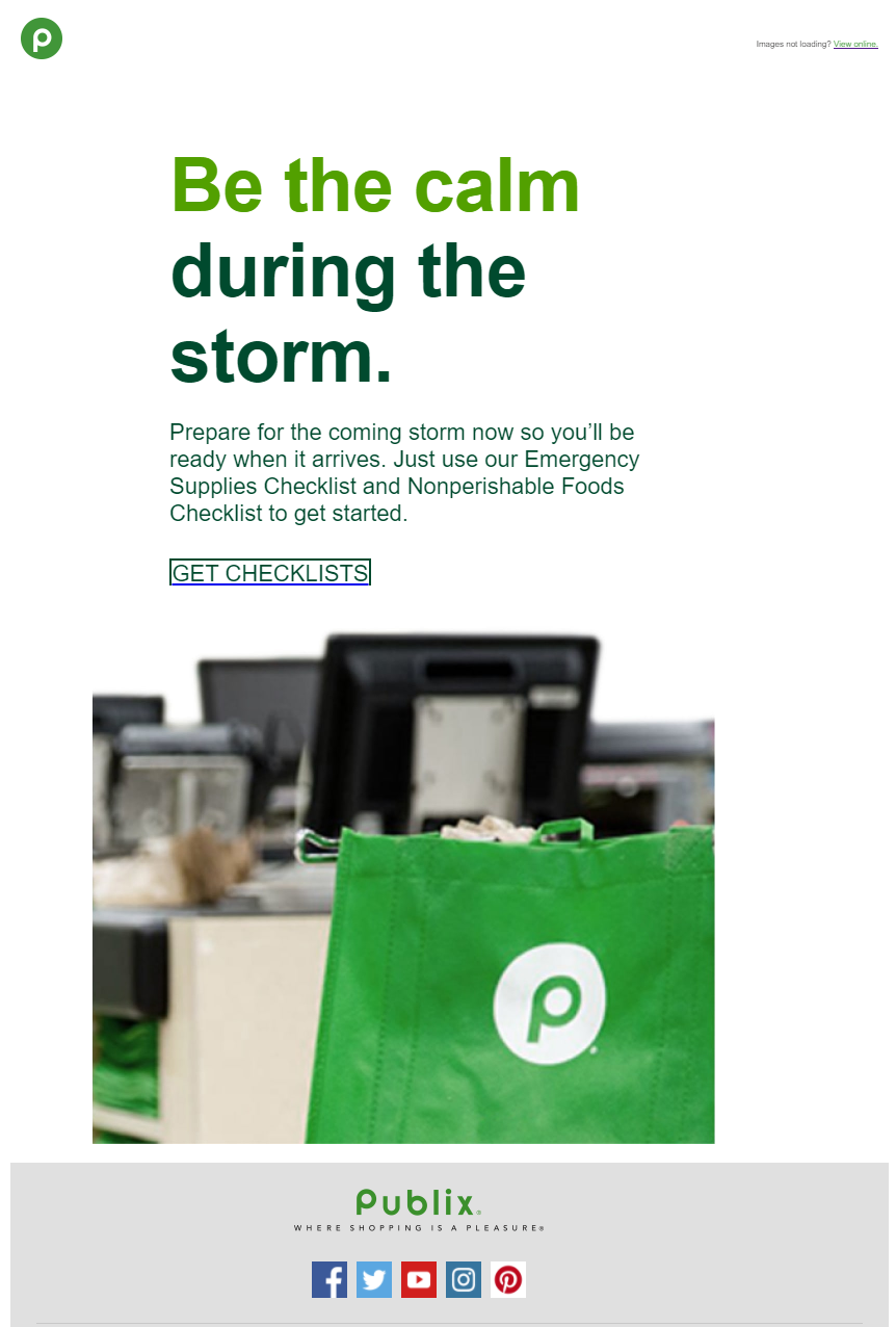 - Penargetan geografis yang relevan dan tepat waktu. Publix mengirim email bertarget geografis ini beberapa hari sebelum badai diperkirakan akan melanda untuk memberi orang cukup waktu untuk mendapatkan persediaan persiapan sebelum badai tersebut.