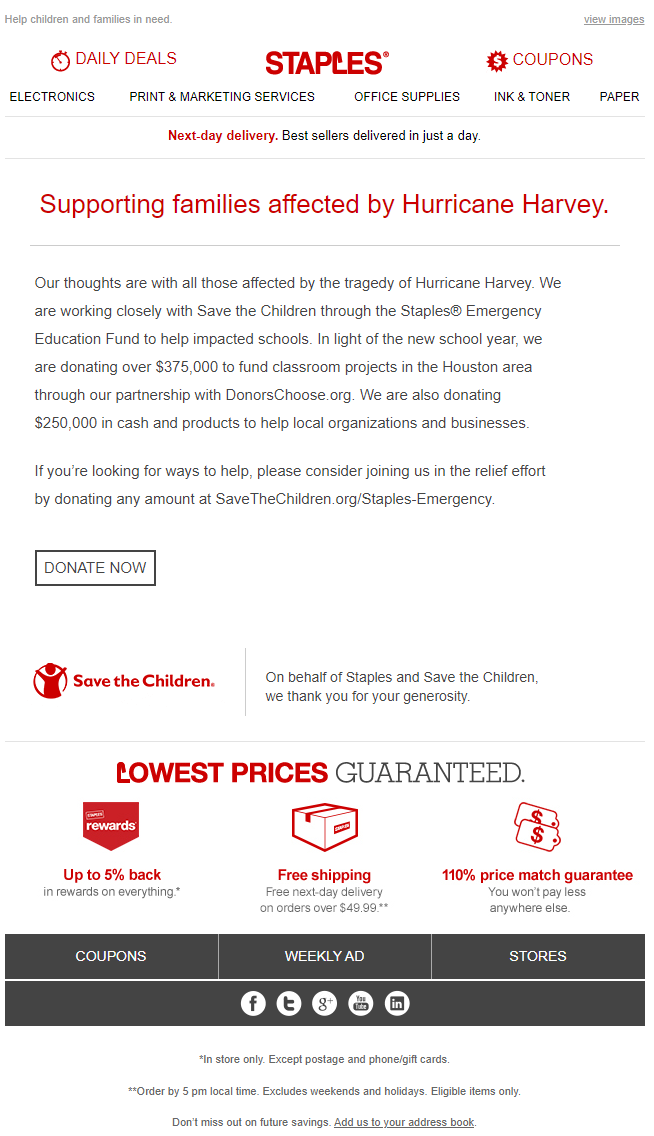 - Tidak termasuk promosi. Staples menahan diri untuk tidak menyertakan konten promosi apa pun di dalam email untuk menjaga tujuan pesan tetap jelas. Hal ini juga turut mendukung keaslian upaya mereka dalam membantu masyarakat yang terkena bencana.