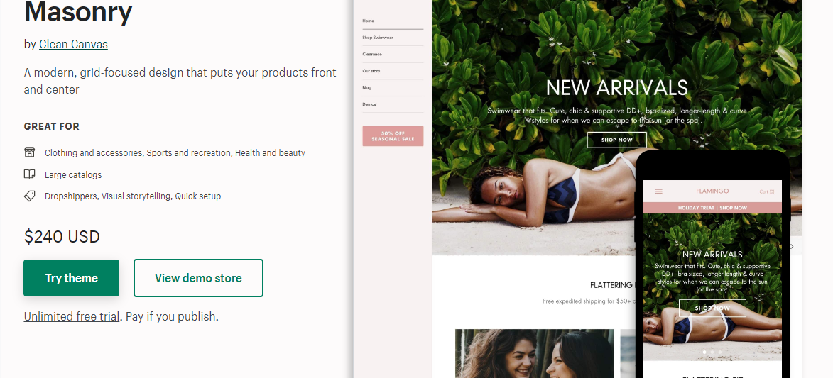 La muratura è un altro tema dropshipping di Clean Canvas. Il suo design a griglia ti consente di centrare i tuoi prodotti sulle pagine dei tuoi prodotti.