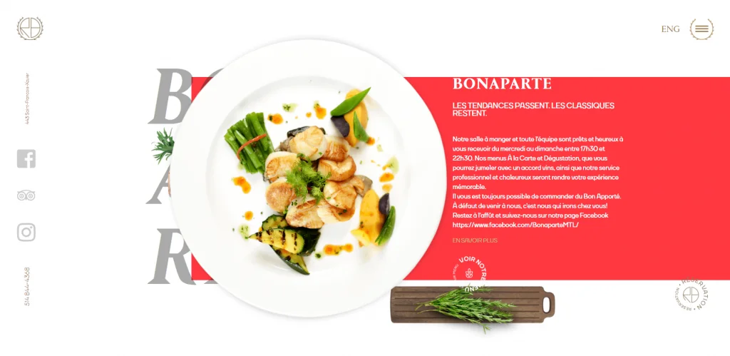 Questo sito Web ha un banner rosso brillante, che cattura immediatamente l'attenzione del pubblico. Questo li aiuta a essere diversi dagli altri ristoranti come ce ne sono, con non molti siti web di ristoranti che hanno un banner luminoso. La homepage è molto semplice ma c'è un menu della barra laterale con tutti gli altri collegamenti importanti. Il loro numero di telefono, indirizzo e link ai social media sono tutti visibili per prima cosa sul lato sinistro della home page. Il sito web di Bonaparte ha un aspetto molto minimalista con scritte piccole e una buona quantità di spazio intorno alle informazioni. Inoltre, ciò consente al sito Web di essere molto pulito e attraente, rendendolo più facile da leggere.