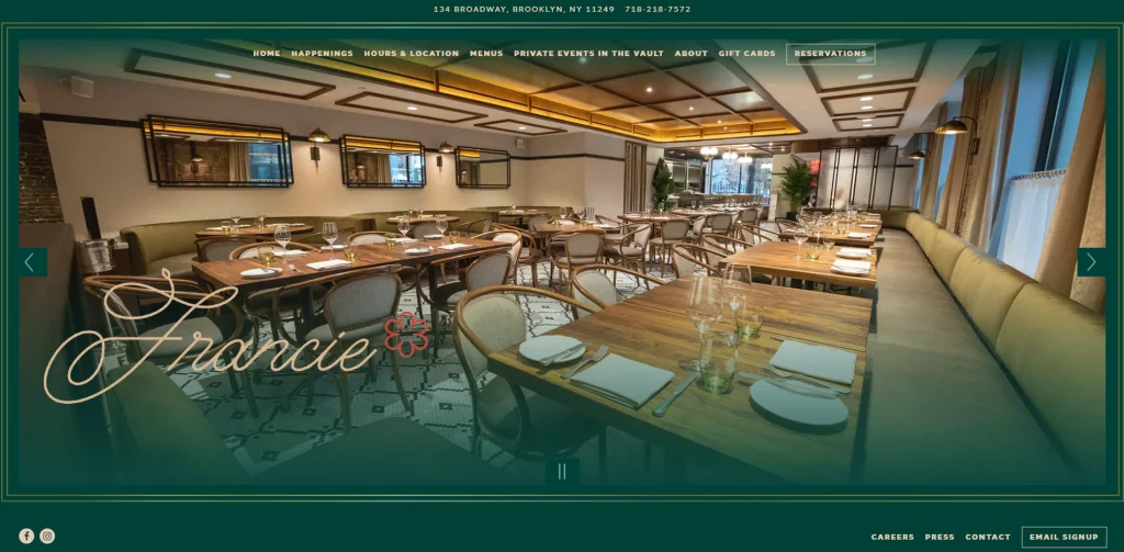 Francie ha un design molto semplice con un buon mix di immagini e testo. Nella parte inferiore della home page, fanno un ottimo lavoro nello spiegare di cosa tratta il ristorante. Questo sito è molto facile da navigare con tutti i collegamenti ben organizzati nella parte superiore e inferiore della pagina. Molti CTA che consentono ai visitatori di scoprire nuove informazioni.
