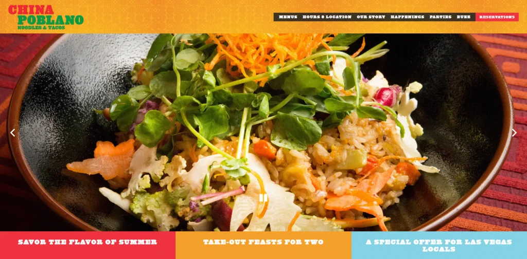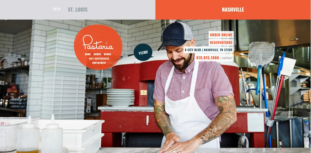 Il sito web di questo ristorante è molto pieno di immagini in movimento e alcune brevi clip in tutto il sito. Con tutte le brevi clip, aiuta il sito Web a distinguersi e mantiene anche l'attenzione del pubblico. Vengono utilizzati alcuni caratteri accattivanti, insieme a colori vivaci che attirano l'attenzione. Alcune caratteristiche che spiccano sono i collegamenti ai social media, l'accessibilità e le CTA forti.