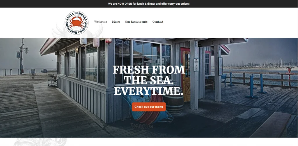 Il sito web di Coast è molto istruttivo e riceve una buona quantità di informazioni sulla home page. Per la combinazione di colori, usano un semplice colore blu che funziona bene in tutto il sito. Molte immagini che mostrano i loro frutti di mare e verso il basso le immagini delle loro diverse sale da pranzo. Mostrare come i ristoranti aiutano i potenziali clienti che stanno cercando di ospitare un evento e vogliono vedere come si presenta all'interno. Il layout rende molto facile leggere tutte le informazioni sulla homepage e quindi entrare in contatto con tutte le loro informazioni in fondo alla pagina, insieme a un pulsante di prenotazione.