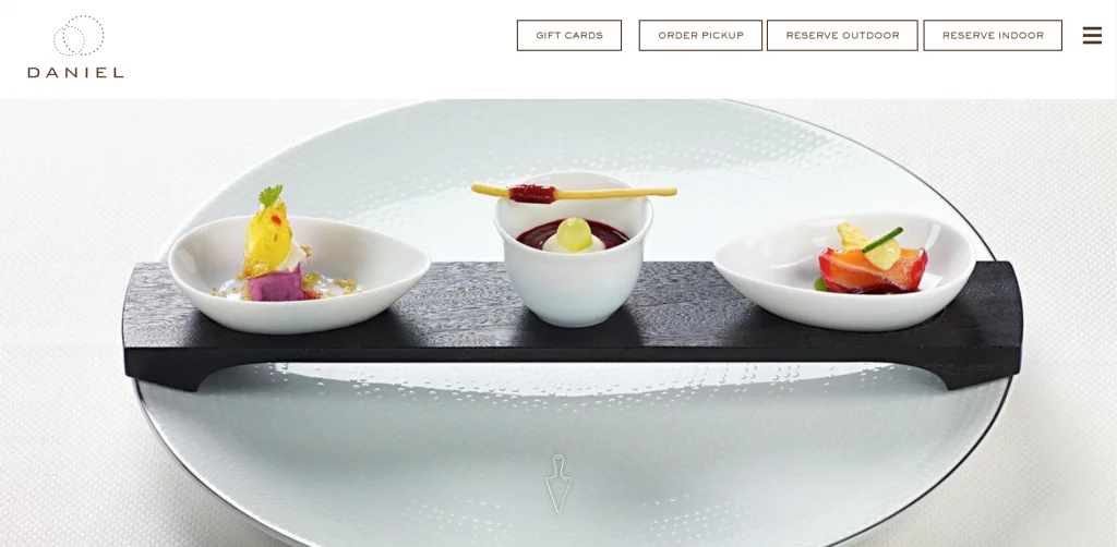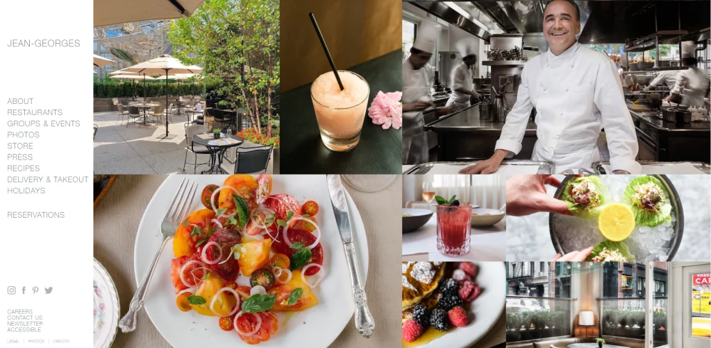 Il sito web di Jean-Georges si distingue in quanto è diverso da altri siti web di ristoranti. Tutti i collegamenti sono sul lato della pagina e il resto della homepage sono immagini. Quando si passa con il mouse sulle immagini, si collegano anche a ulteriori informazioni. Questo sito fa un ottimo lavoro nel mostrare il ristorante attraverso molti elementi visivi in tutto il sito web.