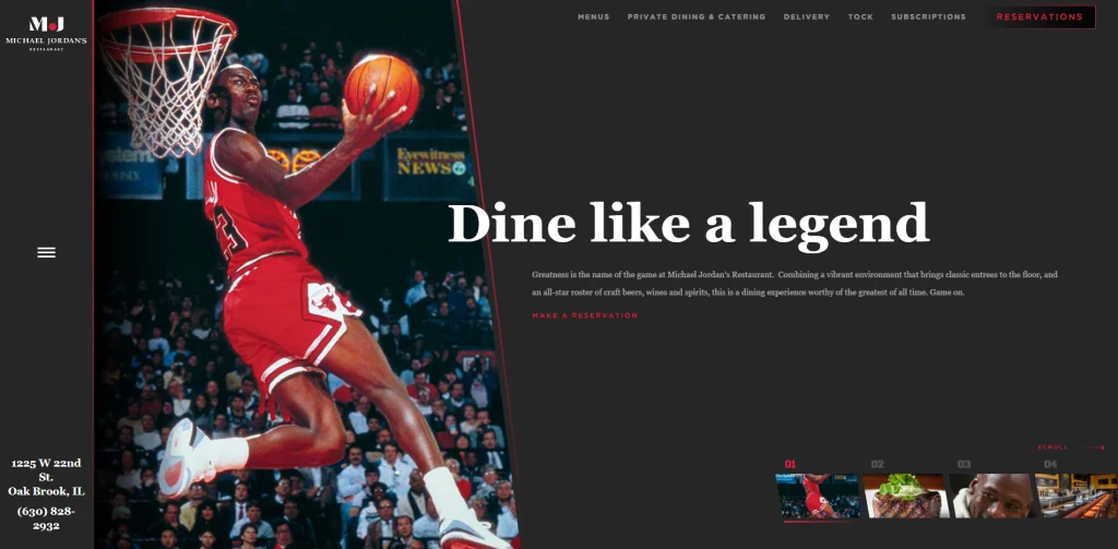 Il sito web del ristorante di Michael Jordan ha un layout unico. Questo si distingue da altri simili. La barra dei menu si trova sul lato sinistro della pagina e durante lo scorrimento sulla homepage il visualizzatore vede solo una sezione di informazioni e deve continuare a scorrere per trovarne altre. C'è un colore scuro per lo sfondo e alcuni tocchi di rosso per aiutare a evidenziare le informazioni. Il numero di telefono e l'indirizzo sono entrambi visibili in fondo a ogni pagina.