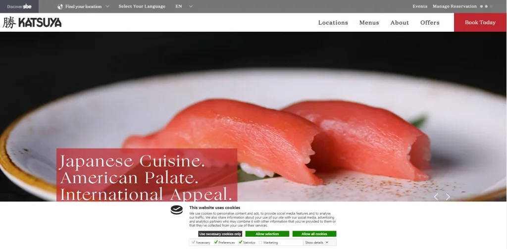 Questo ristorante ha molte posizioni diverse, quindi il sito Web presenta ognuna di esse che mostra come appaiono all'interno. Ciò dimostra che le posizioni sono tutte diverse e uniche l'una dall'altra. Diversi colori di sfondo vengono utilizzati per aiutare a separare le informazioni, il che aiuta la pagina e aiuta il pubblico a non confondersi. C'è una sezione di social media sulla homepage che mostra le esperienze dei clienti e consente ai visitatori di leggere le esperienze delle persone felici.