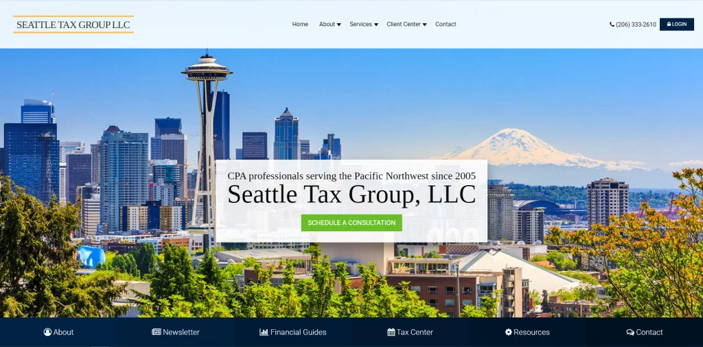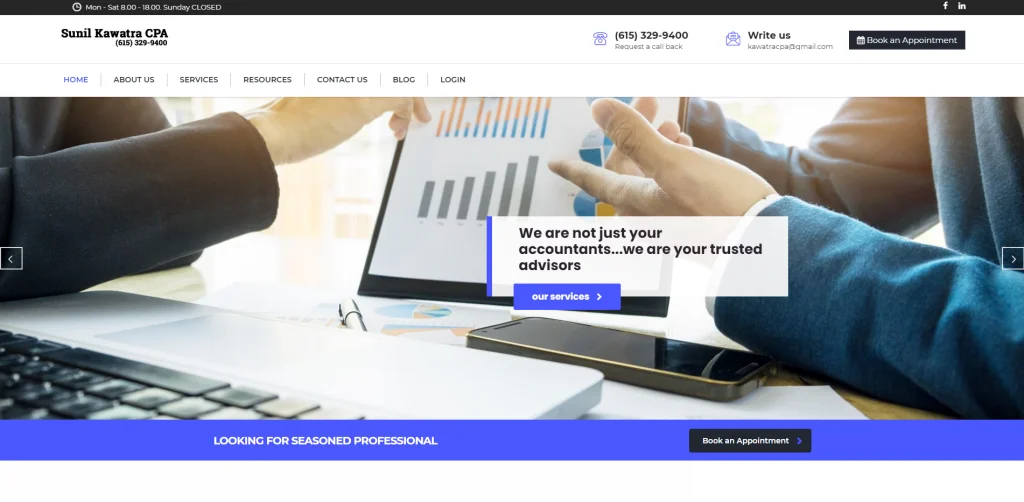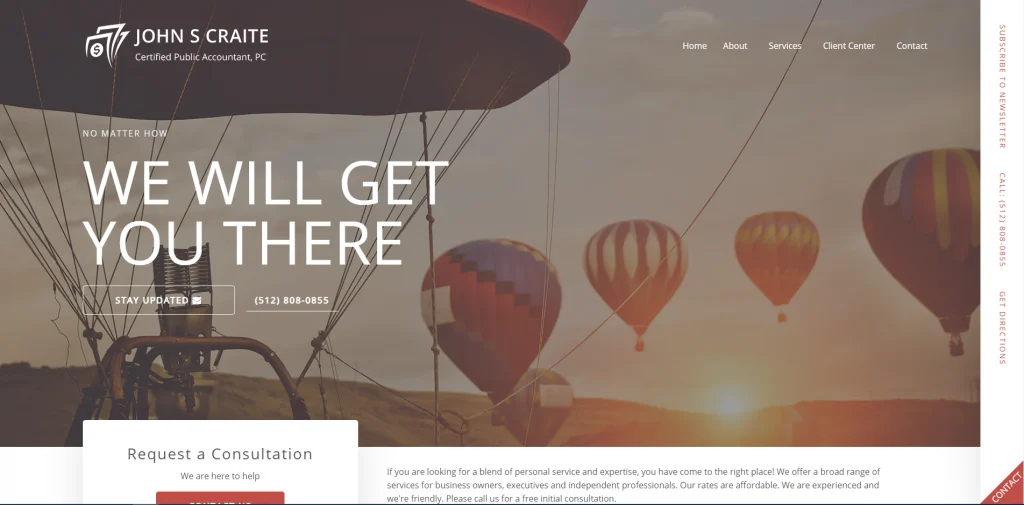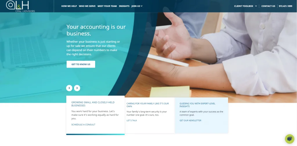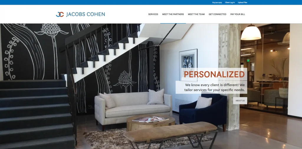 Questo è un ottimo esempio di un sito web per ragionieri che si distingue da altri simili. Perché il loro numero di telefono è visibile da molti punti diversi. Inoltre, c'è un modulo di contatto per potenziali clienti e anche un accesso sicuro e un modo sicuro per inviare documenti per i clienti di ritorno. Semplifica il contatto con l'azienda e anche tutte le tue informazioni in un unico posto dopo essere diventato un cliente.