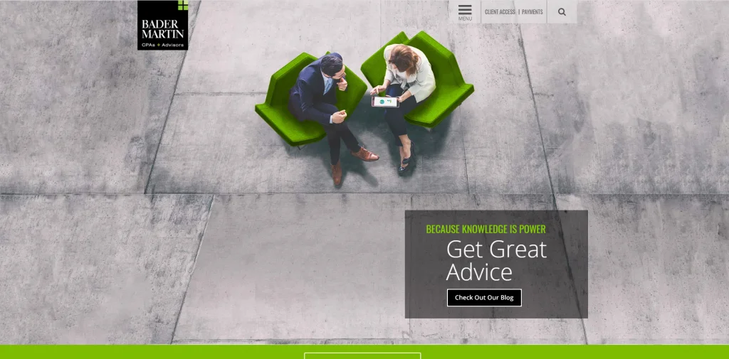 Il sito Web di Bader Martin ha una combinazione di colori verde e blu brillante. Sulla home page, presentano solo blog aggiornati, il resto delle informazioni si trova nei collegamenti nella parte superiore e inferiore della pagina. Questo è un layout unico e un colore audace che li distingue dagli altri siti Web di contabilità. Sul lato della pagina, ci sono collegamenti a LinkedIn, e-mail, Twitter, Facebook e molti altri. Ciò consente alle persone di connettersi attraverso diverse piattaforme e anche di scoprire ulteriori informazioni sull'azienda.